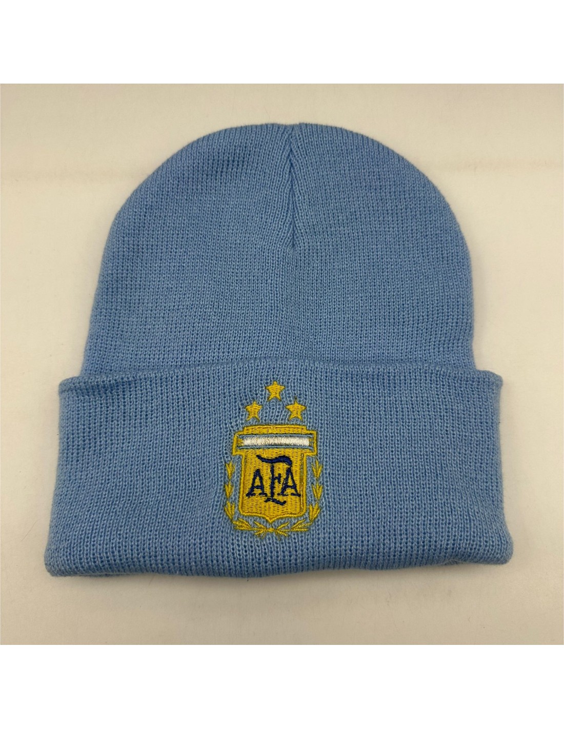 Gorro tejido celeste con bordado de escudo AFA.